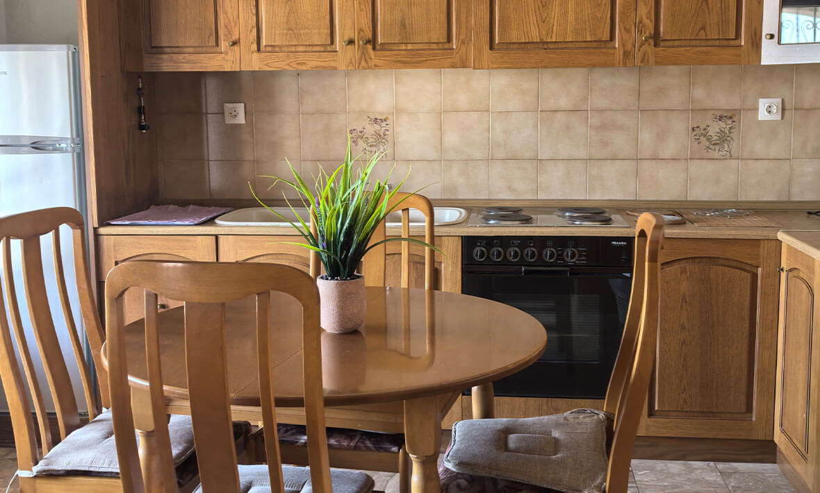 Η πλήρως εξοπλισμένη κουζίνα και η μεγάλη βεράντα δημιουργούν μια αίσθηση οικειότητας και χαλάρωσης, προσφέροντας όλες τις ανέσεις ενός σπιτιού.