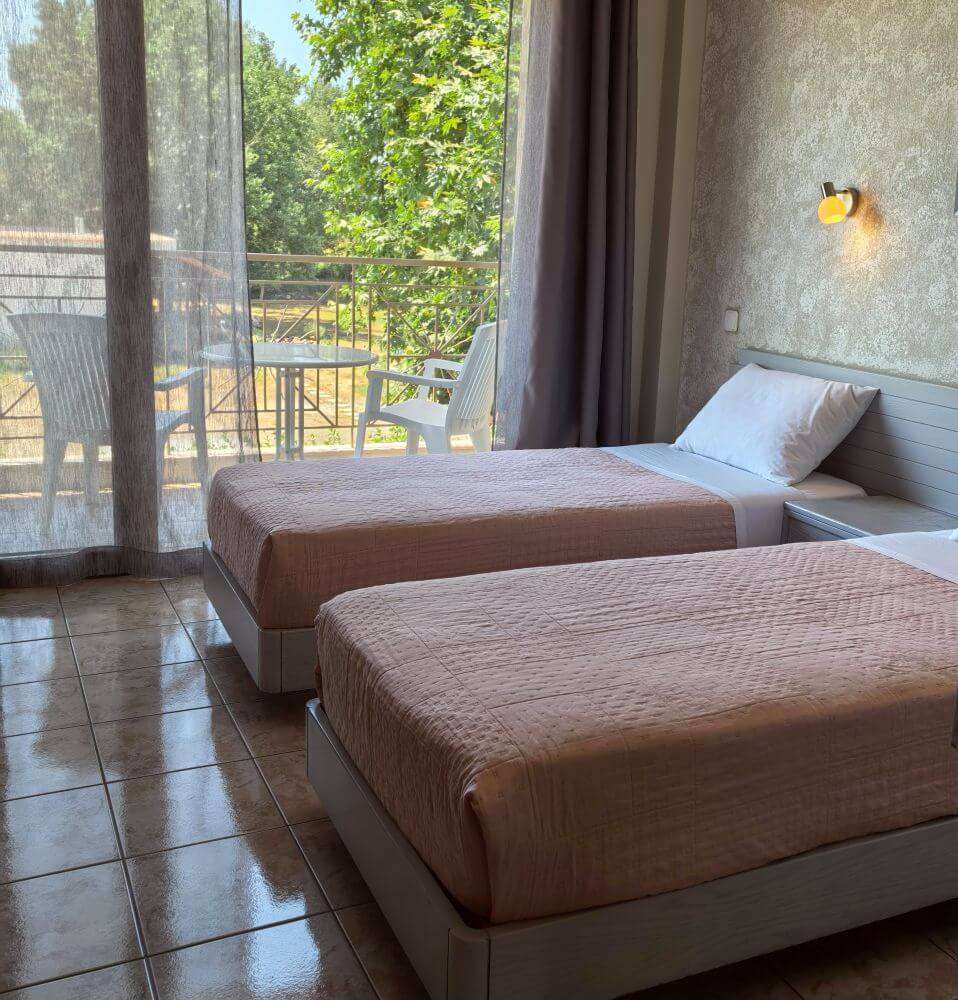 Τα δίκλινα δωμάτια διαθέτουν ένα διπλό ή δύο μονά κρεβάτια, ενώ τα τρίκλινα περιλαμβάνουν ένα διπλό και ένα μονό κρεβάτι, καλύπτοντας διαφορετικές ανάγκες φιλοξενίας.